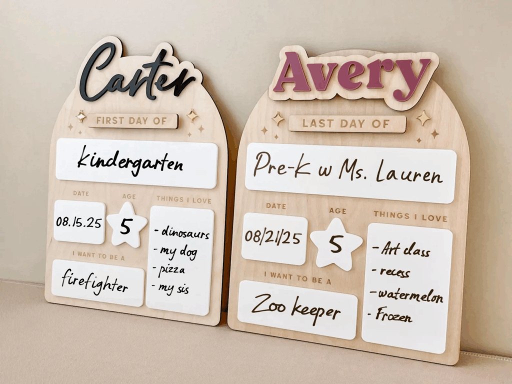 I am a little late to the party on this, but I really wanted a back-to-school sign to document each school year with my girls, and I was not impressed with the options at Target and Walmart. I love that you can swap out the name plate on this sign, so it can be used with all three of my girls. The owner of this Etsy shop has been very responsive, and I can’t wait to use it for years to come!