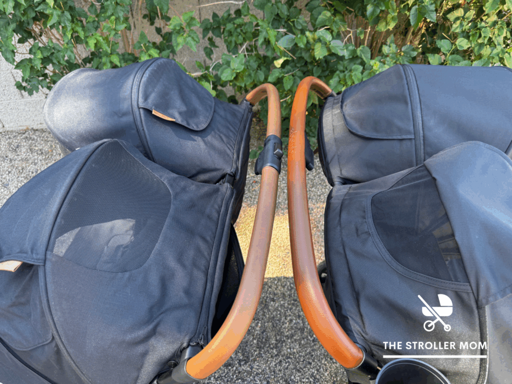 Both strollers have decent handlebar heights, but neither has an adjustable handlebar. The canopies rest on your hands when not extended. I really don’t love this, but I just push the canopy out a little and the problem is solved!