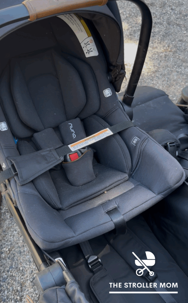 The Nuna bumper bar doubles as a car seat adapter, which is amazing, but you will have to lift your other child out when using it with a car seat because you won’t be able to open it without removing your baby.