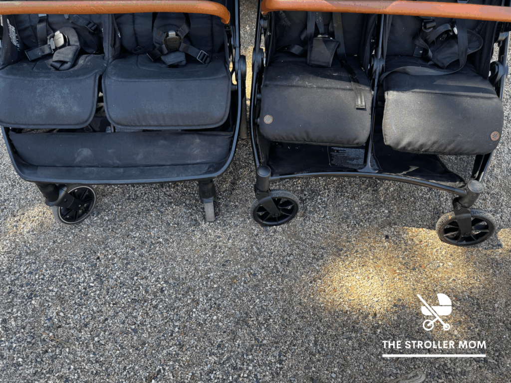 I have tested both of these strollers, and because of the wheel size, the Nuna TRVL DUBL has had one of the best lightweight side-by-side pushes I have tried. I will mention that there is something about the weight distribution of this stroller, which makes it a bit unstable, and it tends to jolt forward on bumps in sidewalks. This is not uncommon with double strollers, but the Nuna TRVL DUBL is more startling than most, so be cautious of that.