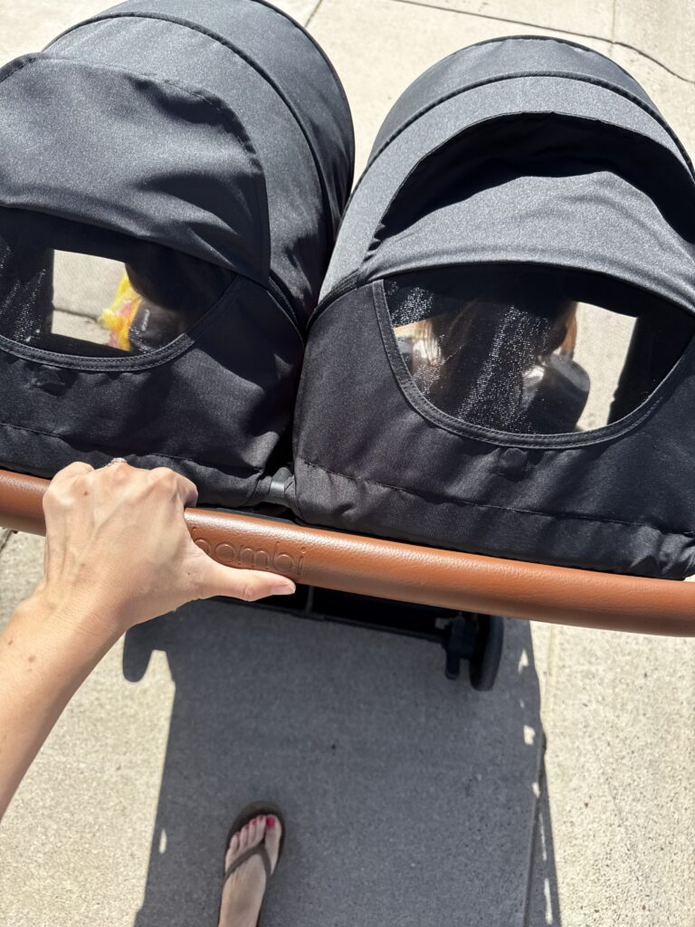 Both strollers have independent canopies that sadly touch your hands when not extended, but the Bombi Twin offers better coverage, especially for the toddler years. This is probably the biggest downside I have found with the Nuna TRVL DUBL, apart from price. The canopy does not come down enough for toddlers, especially tall toddlers. Also, when the canopy is extended and the seat is in the most upright position, the canopy is really close to their faces.